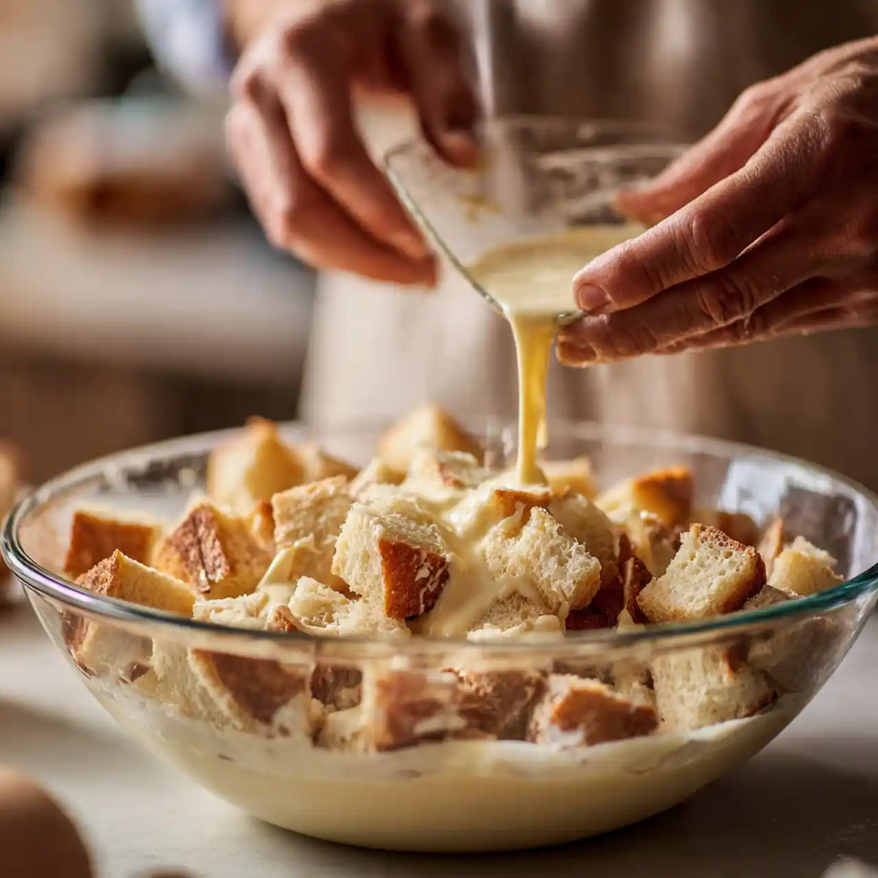 - Combine: Add bread cubes to the bowl and gently toss until evenly coated. Let sit for 5 minutes so the bread starts absorbing.