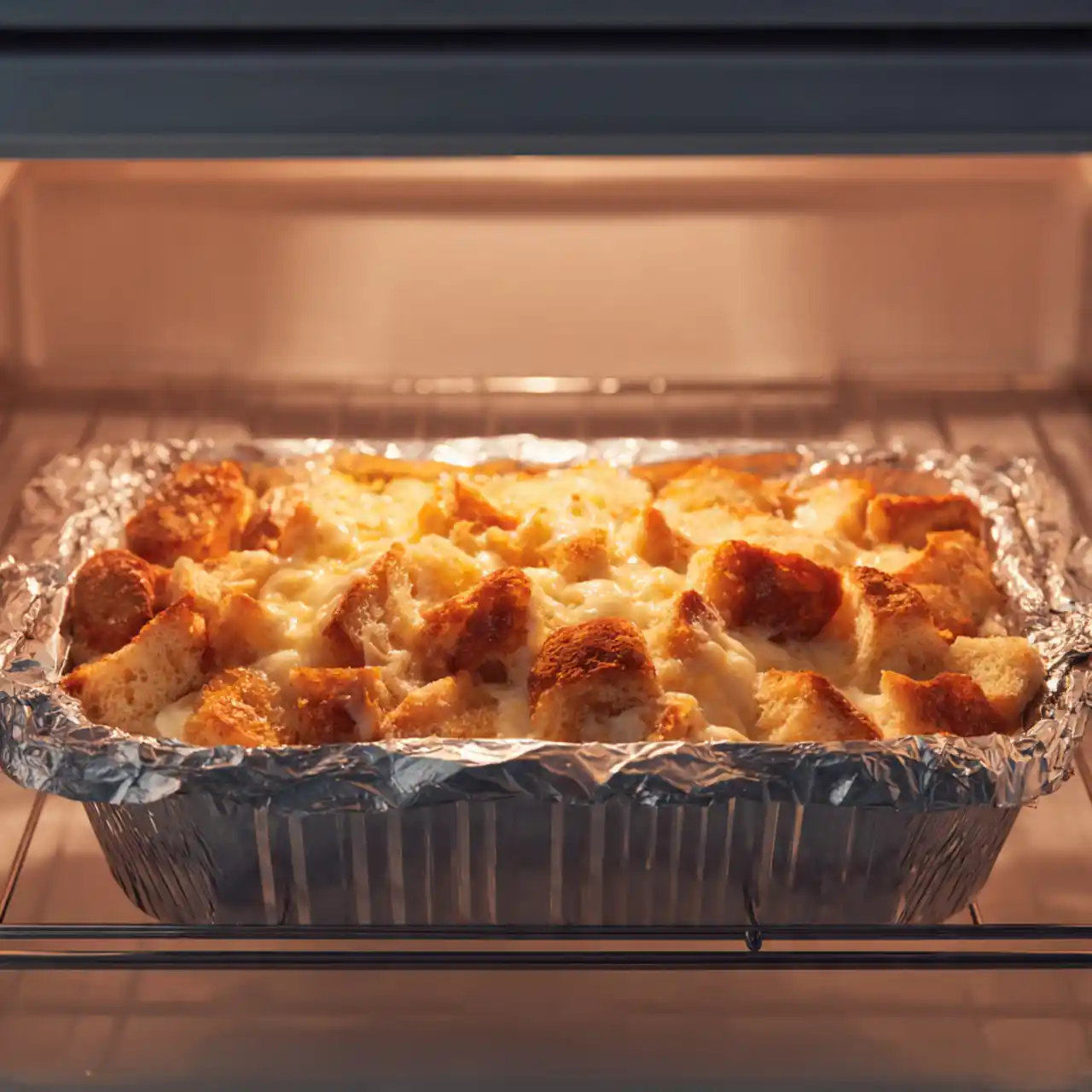 - Bake: Cover with foil and bake for 20 minutes. Remove foil and bake another 25–35 minutes, until the top is golden and the center is set but still slightly custardy. A knife inserted in the middle should come out mostly clean, not wet.