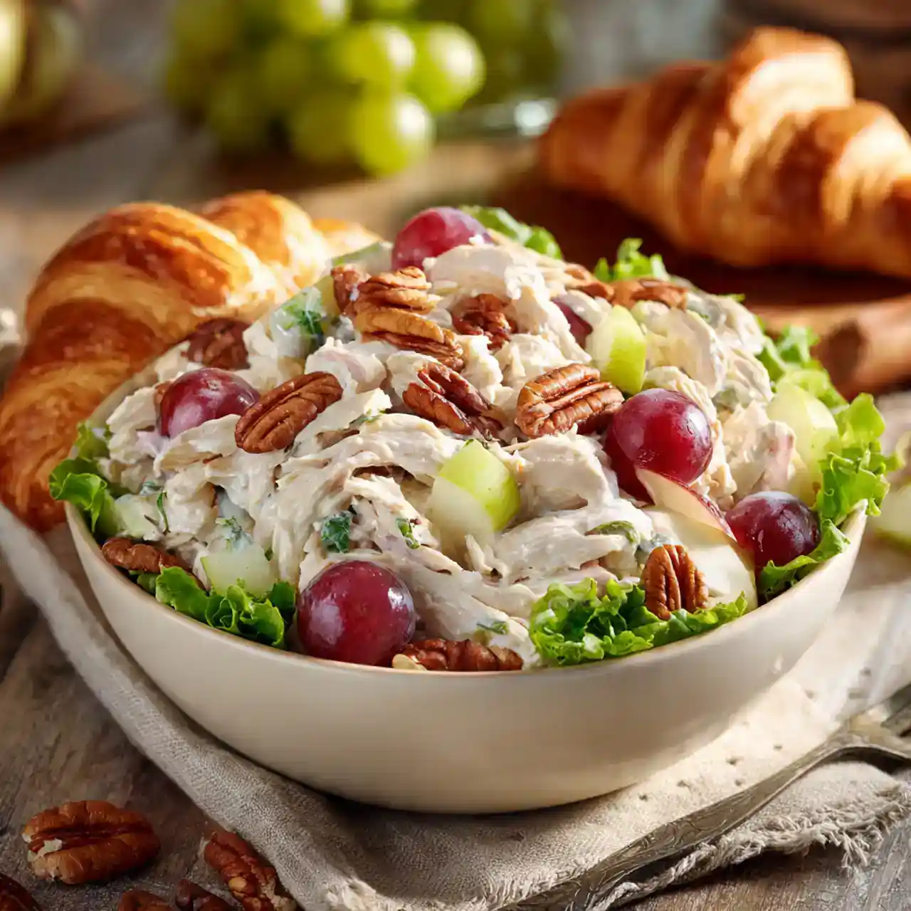 A buttery croissant is the classic and most beloved pairing — the rich, flaky pastry complements the creamy salad perfectly. For a lighter option, butter lettuce cups are elegant and low-carb. Hawaiian rolls are a crowd-pleasing option for parties. Ritz crackers make an excellent appetizer presentation alongside the bowl.