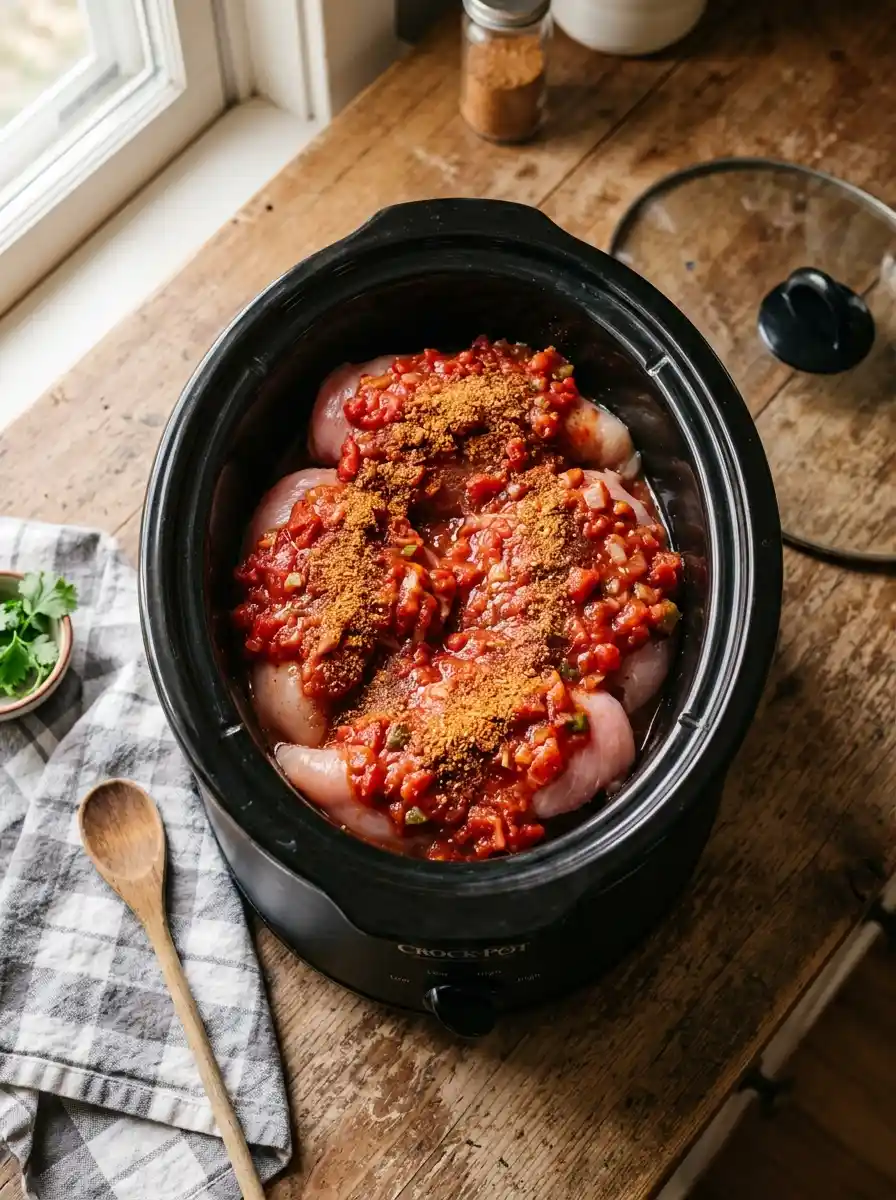 1. Layer the ingredients: Place the chicken in the slow cooker. Sprinkle the taco seasoning evenly over the top. Pour the salsa over everything, making sure the chicken is mostly covered.