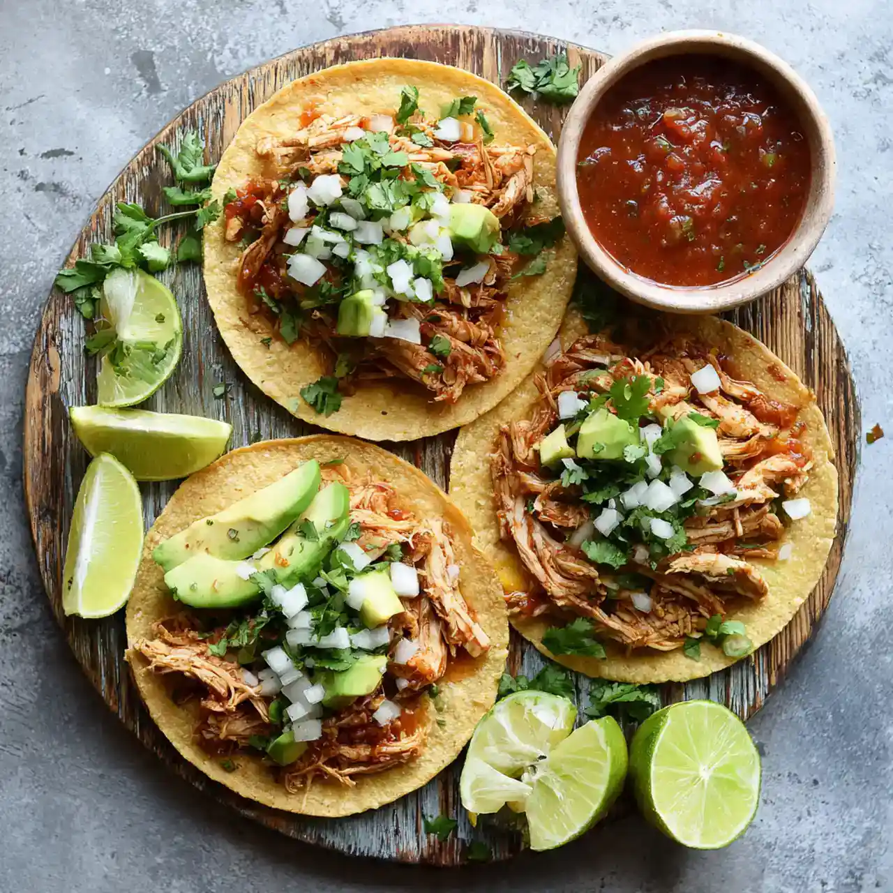 6. Assemble the tacos: Spoon chicken into tortillas and add your favorite toppings—think onion, cilantro, avocado, cheese, and a squeeze of lime.